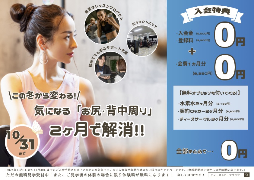 【現在ディーズでは8月入会キャンペーン開催中!!】 特典① 入会金0円 特典② 登録料0円 特典③ 月会費1ヵ月0円 特典④ 水素水2ヶ月0円 特典⑤ レンタルタオル2ヶ月0円 特典⑥ サークル3か月0円 キャンペー […]